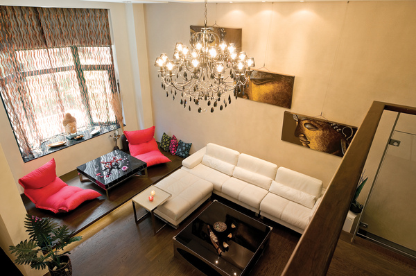 客廳的角窗空間規劃了一個開放式的休閒區,假日午後陽光由窗外盡情揮灑於此,在此看書、飲茶、小憩,舒服自在。