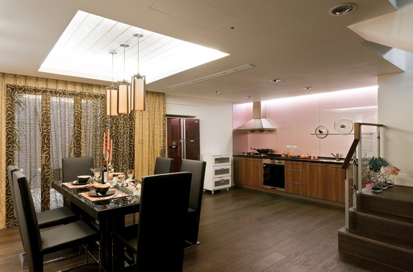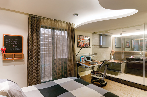 餐廳與書房作區隔以波浪式地板和天花板添加了趣味及休閒渡像海浪線條...