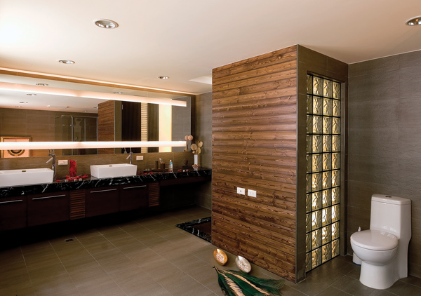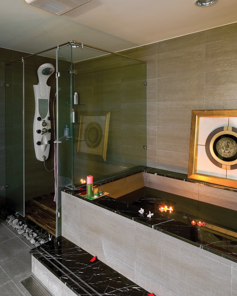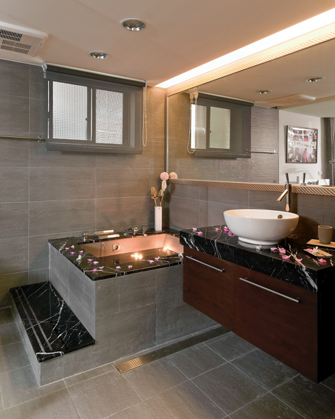 選擇了質感貼近自然的版岩磚,延伸至浴缸,洗面盆檯面與浴缸上面飾以沉穩的黑雲石大理石,極為高雅,也相當便於整理清潔。